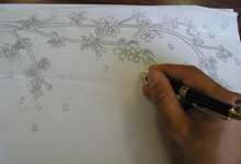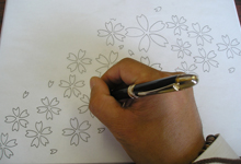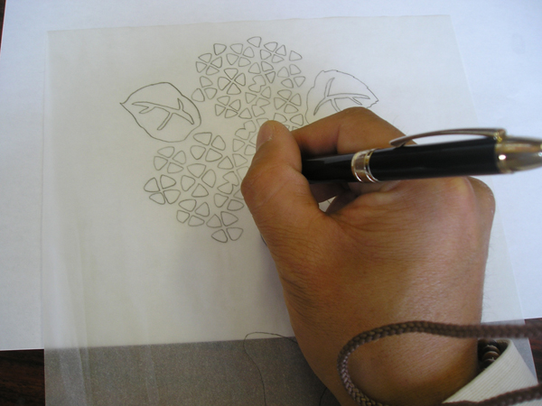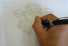 故人と奥様が好きだったアジサイの花を彫刻したいと奥様が持ってきたアジサイの写真をデッサンし彫刻。