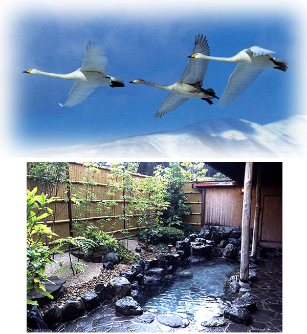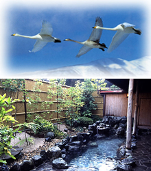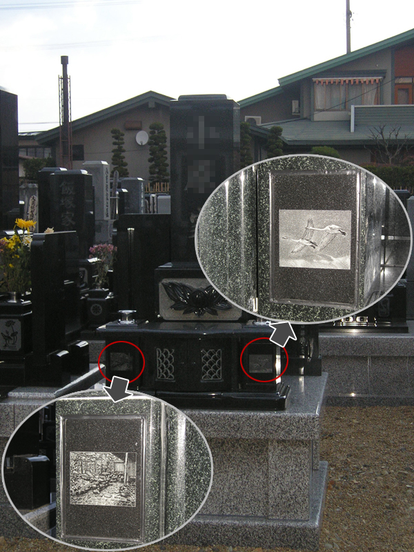 故人が生前ライフワークにしていた白鳥のエサやりと、大好きだった露天風呂を形に残したいとの想いを花立に彫刻する。